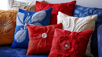 serene bedroom scene featuring plush tufted headboard vibrant orange accent wall adorned assortment throw pillows