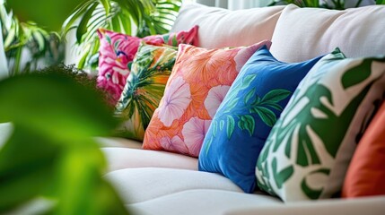 Colorful tropical fruit-themed pillow on a cozy sofa, perfect for summer home decoration or vacation rental staging