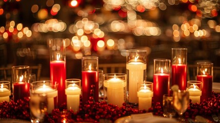 Dramatic pops of red and gold in the décor accentuate the warm glow of the candles casting a subtle but gl touch to the space. 2d flat cartoon.