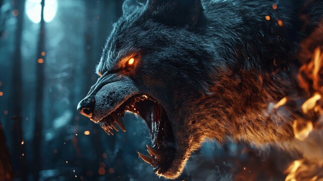 A detailed side profile of a snarling werewolf with glowing eyes, captured in a dark, eerie forest. Flames and embers accentuate the menacing atmosphere.