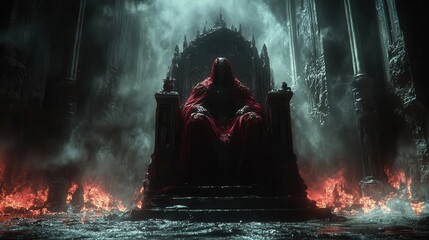 ominous demon lord perched regally on an ornate obsidian throne dark shadows and glowing embers accentuate its menacing form creating an atmosphere of dread and power
