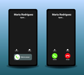 Smartphone Call Screen Set. Interface. Slide To Answer. Accept Button, Decline Button. Incoming Call.   Call Screen Template. Smartphone, Phone Call Screen Vector Mockup On Violet Background