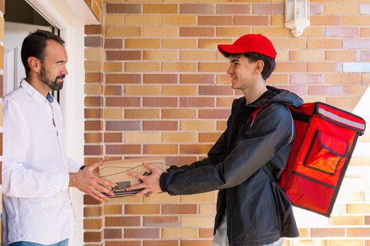 delivery postman handing a parcel box to the recipient, accepting a parcel from a cardboard box from a postal item, the concept of a home courier and a delivery service