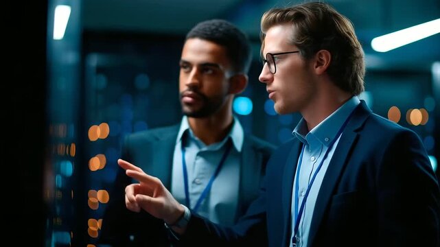 Security professionals accessing database systems anonymous experts defocused high tech environment cybersecurity operations scene digital security workspace technical