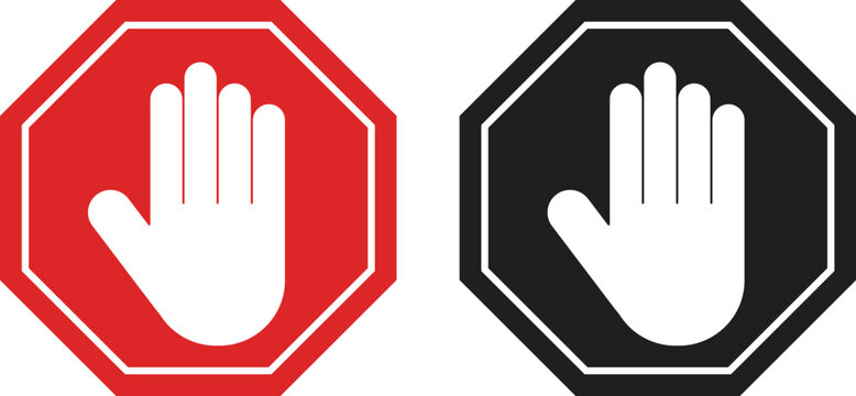 Stop hand icon set in black and red . Red forbidding sign with hand . No entry hand sign . Vector illustration