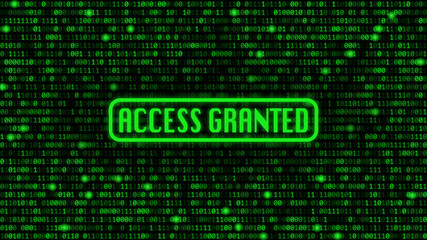 Green binary code background with "access granted" text.