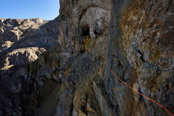 One level on a cliff face containing three caves remained illusive. The team had been forced to look at it from their camp and often pondered about access and how to climb up to it.