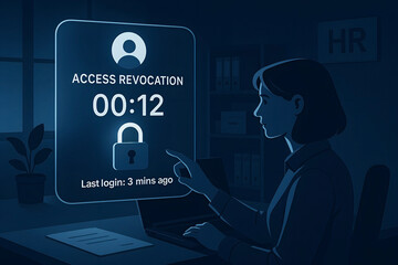Illustration of access revocation alert on a computer screen depicting security breach and digital privacy threats
