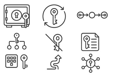 Key Management Icons. Line style icons of key management systems: key vault, secure key rotation, key lifecycle flow, distributed