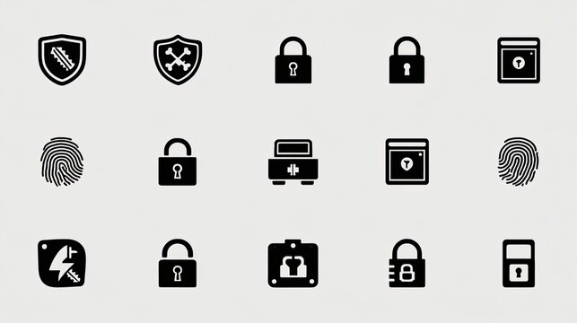 Security and privacy icon set with shield, lock, fingerprint, firewall, antivirus, encryption, and access control