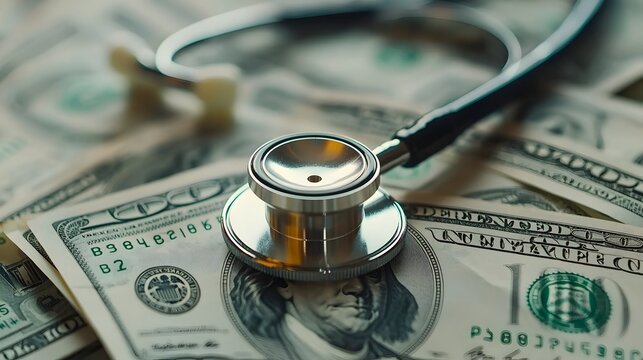 Stethoscope on a pile of dollar bills.