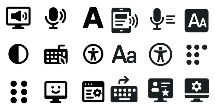 Accessibility and digital communication solid icons set – web, filled, user interface symbols