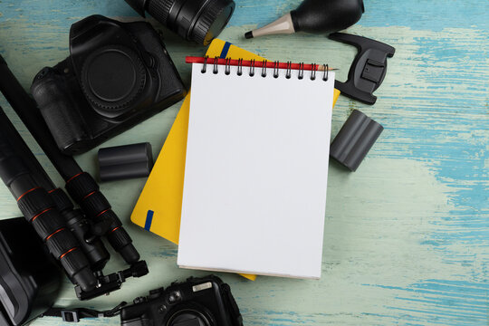 Mix of old cameras, equipment and accesseries on blue wooden desk background, photography concept