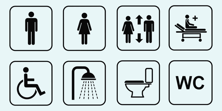 Close-up of modern public restroom sign with male and female icons on a metallic plate. Contemporary hallway with warm sunlight, suitable for design, architecture, and accessibility concepts.
