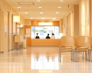 A serene hospital corridor with empty wooden chairs and a warm ambiance, highlighting tranquility in a healthcare setting.