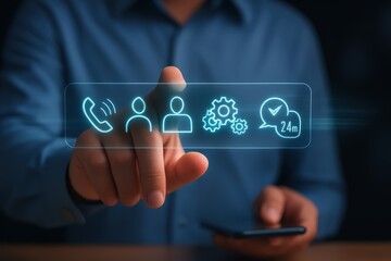 A person's finger interacts with a holographic interface displaying contact, collaboration, and 24-hour support options.