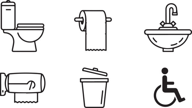 Six public restroom outline vector icons illustration set toilet sink and accessible sign isolated on white background