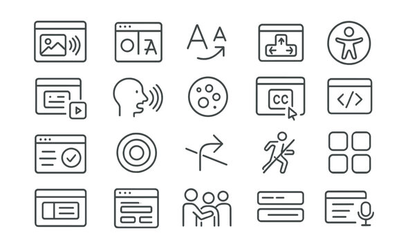 Line style icons of accessibility in UI: screen reader, high contrast, text resize, keyboard nav, accessible icon, alt text, voice commands, color blind mode, subtitles, aria label, UI accessibility,