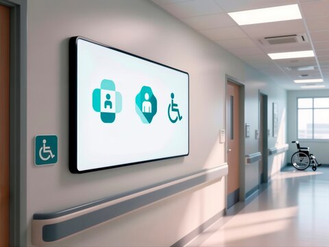 Digital wayfinding screen with accessibility icons in a modern hospital corridor.