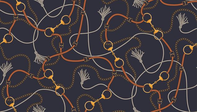 gold chain , leather belt,  Passementerie seamless pattern ,metallic rope,  luxury accessories , silk scarves , repeate pattern . Baroque vintage design , old school  fashion navy brown