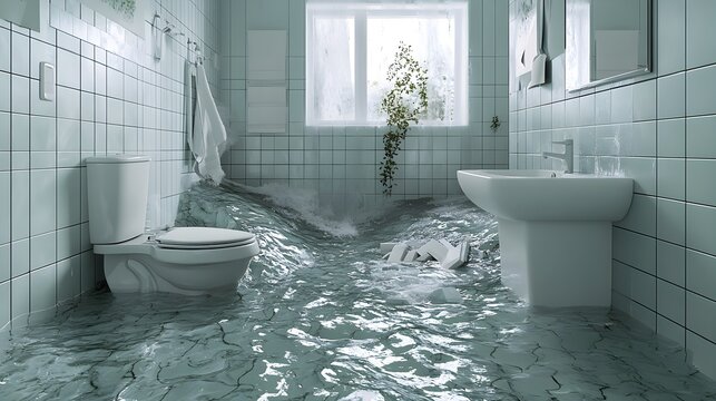 Bathroom flooding disaster, water covering the tiles, spilling from sink and toilet, realistic damage scene for insurance purposes