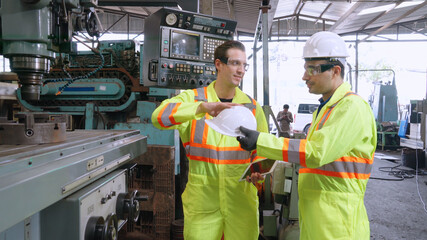 Factory worker warn coworker about safety and give hardhat to him . Injury prevention and safety first concept .