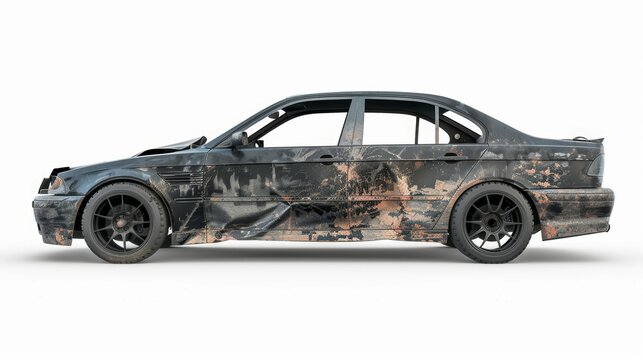 Front and side view of a severely damaged white pickup truck after a road collision, isolated on a white background with a clipping path included.