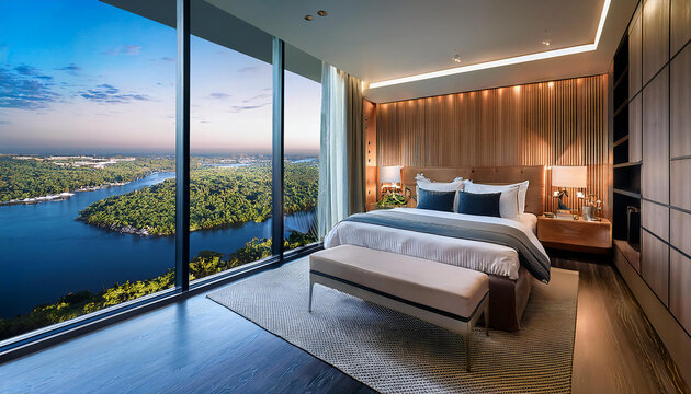 Modern and luxurious master bedroom with views of a river in the city condo or hotel accommodations