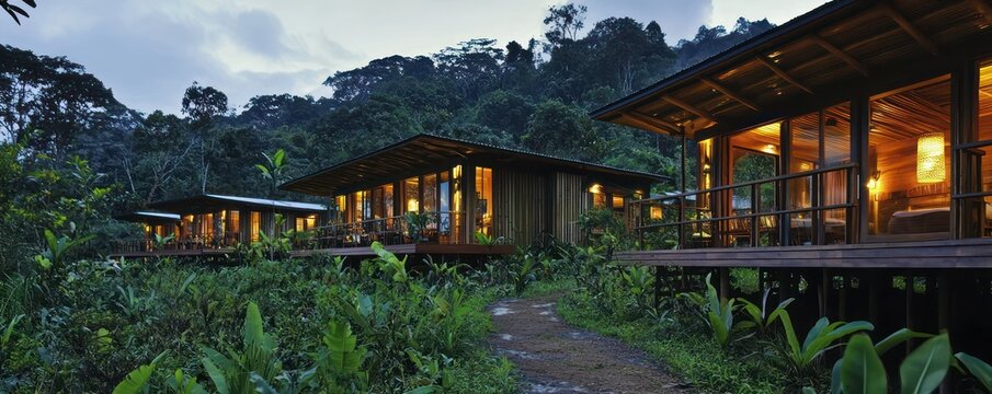 An eco-tourism lodge with James Hardie siding that blends with its jungle surroundings, offering eco-friendly accommodations and promoting sustainable tourism practices