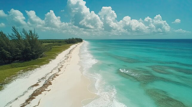 A tropical beach with clear turquoise water, white sand, and lush greenery, featuring luxury accommodations along the shoreline