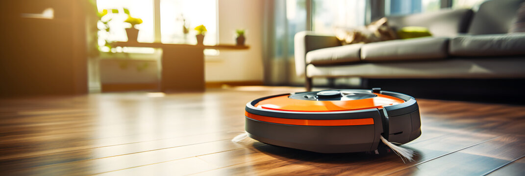 Robot vacuum cleaner on the floor in the modern living room close-up