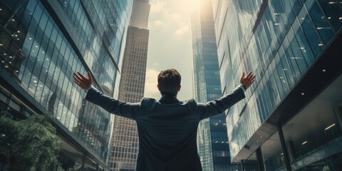 Leadership with a businessman expresses celebrate achievement his joy by raising his arm. generative AI
