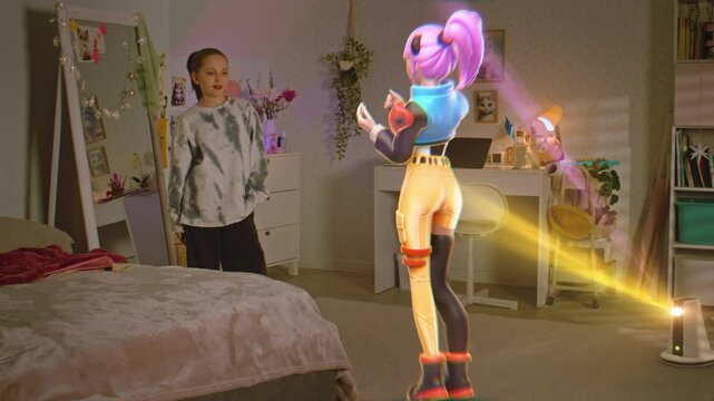 Teen girl chats with 3D animated avatar in cyberspace, shows gymnastics skills in bedroom. Futuristic VFX animation of virtual reality holographic character. AI friend technology. Augmented reality.