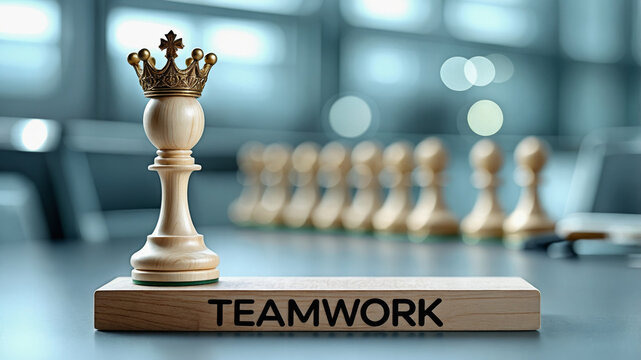 Symbolizing success through teamwork, a pawn crowned with ambition stands out, showcasing unity in strategy and motivation
