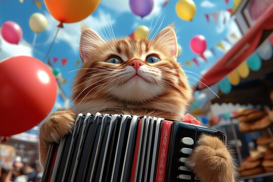 Cat musician playing an accordion during a festive street fair, illustrated in a colorful scene where the cat entertains passersby with lively tunes, surrounded by food stalls, balloons, and