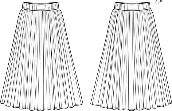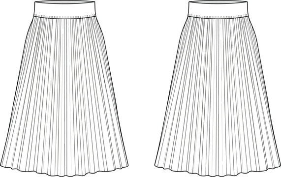 Pleated skirt technical flat sketch, front and back view, apparel fashion design template, women's clothing mock-up, vector illustration, accordion pleats detail.