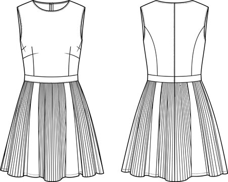 Women's Mini Dress Technical Fashion Flat Sketch, Sleeveless Bodice, High Waist, Accordion Pleated Skirt, CAD Template Vector Illustration.