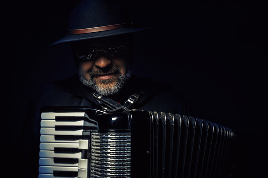 the charismatic presence of a male accordionist during his performance on stage, his eyes conveying passion and artistry, highlighting the artist's talent,