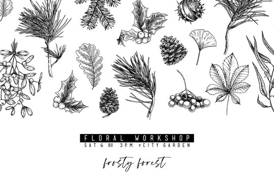 Hand drawn detailed Christmas banner. Vector forest pine, cone, mistletoe, holly, accorn, berries. Xmas, New Year minimalist design. Holiady sale, advertisement, shop promotion brand merchandising.