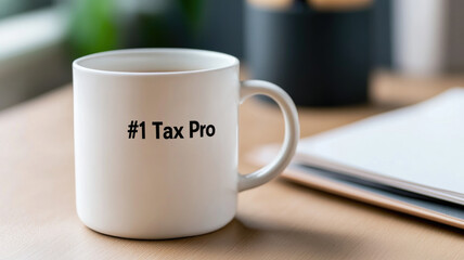 White mug with "#1 Tax Pro" text on office desk