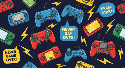Colorful Retro Video Game Controllers and Handheld Consoles Seamless Pattern with Lightning Bolts.