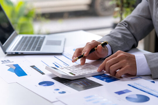 Businesswoman accountant working on desk using laptop for calculate money and checking finance report. Selected focus