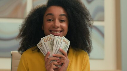 Happy rich African american ethnic business woman bank employee financial accountant counting money dollars in office workplace excited joyful businesswoman girl count cash salary finance budget smile