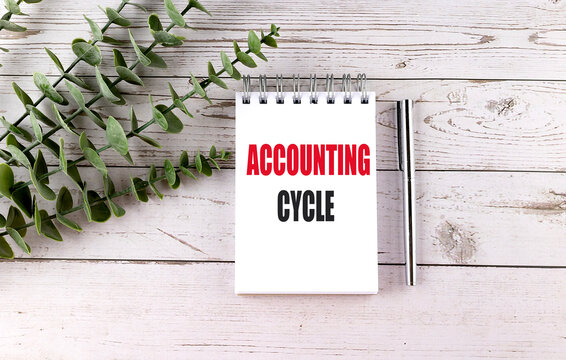 Notebook with the text accounting cycle on a white wooden table, surrounded by green eucalyptus branches and a silver pen