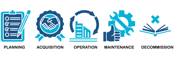 Asset lifecycle banner web illustration concept with icons, planning, acquisition, operation, maintenance, and decommissioning