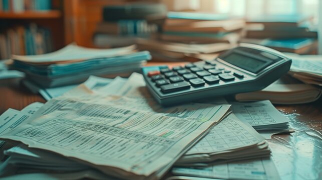 An overflowing desk with a calculator, piles of paperwork, and financial documents, depicting the intensity and overwhelm of accounting work, accounting work overwhelm with calculator and papers.