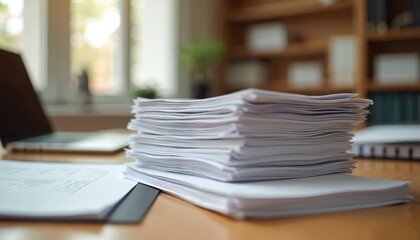 Stack of paperwork documents on desk with blurred laptop. Business papers, contracts, agreements on workplace. Legal, finance documentation, accounting records. Office routine, administration,