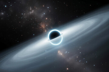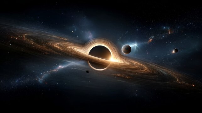 Astronomy Background, Black hole surrounded by a glowing accretion disk, with stars being pulled into its gravitational field, creating a dramatic space scene. Illustration image,