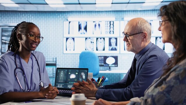 African american assistant and patients engage in medical checkup with hospital records and x ray results files to find accurate treatment for wellness and recovery. Healthcare practices. Camera A.