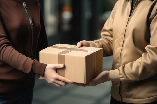 A male courier hands a package box. Connection between businesses and customers, embodying the reliability crucial for a smooth delivery experience.